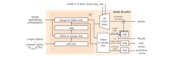 提示编码器的设计遵循了SAM的原则,能够接受点击、框选或遮罩等不同类型的提示,以定义给定帧中对象的范围。这些稀疏提示通过位置编码和学习到的嵌入表示进行表示,而遮罩则通过卷积操作进行嵌入,并与帧嵌入相加。