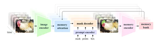 图像编码器作为SAM-2处理视频帧的起点采用了流式处理方法,能够处理任意长度的视频,相比第一代可以使用更少的交互提升3倍效率。它使用的是一个预训练的Hiera模型,能够提供多尺度的特征表示,为后续的记忆注意力模块和掩模解码器提供丰富的上下文信息。