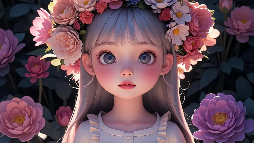 Prompt:OC 渲染,3D 设计,长发小女孩,人脸朝着镜头,中心构图,帽子上长满鲜花,轮廓清晰,面部细节放大,帽子细节放大,画质高清,超清画质,深景深,背景是花海