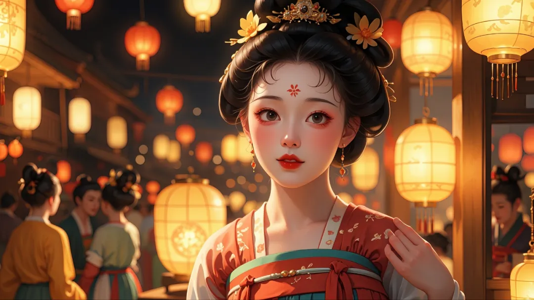 Prompt:超写实画风,唐代,长安,元宵节夜市,唐代侍女,灯火辉煌,细节完美,特写,热闹非凡,超高清,4K