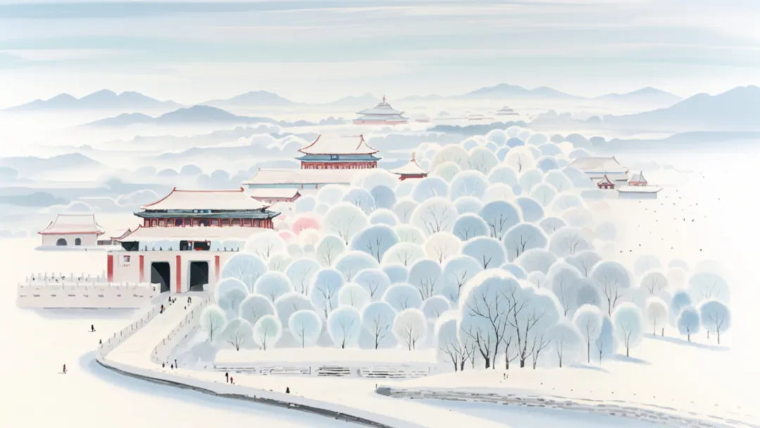 Prompt:国**墨绘画,点彩、肌理磨砂、陈家泠、大面留白的构图,高清16k故宫远景,雪景、流畅建筑结构,层次,白色主色,淡雅