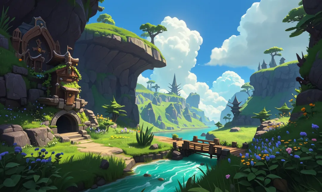 Prompt:World of Warcraft, outdoor scene, green grassland with a river flowing through it, rocky cliffside with a cave entrance, a small wooden bridge over the waterway, lush trees and wildflowers on both sides of the stream, white clouds in a blue sky, fantasy landscape concept art style, game illustration design, concept design for world building, concept art in the style of game illustration design, 3D