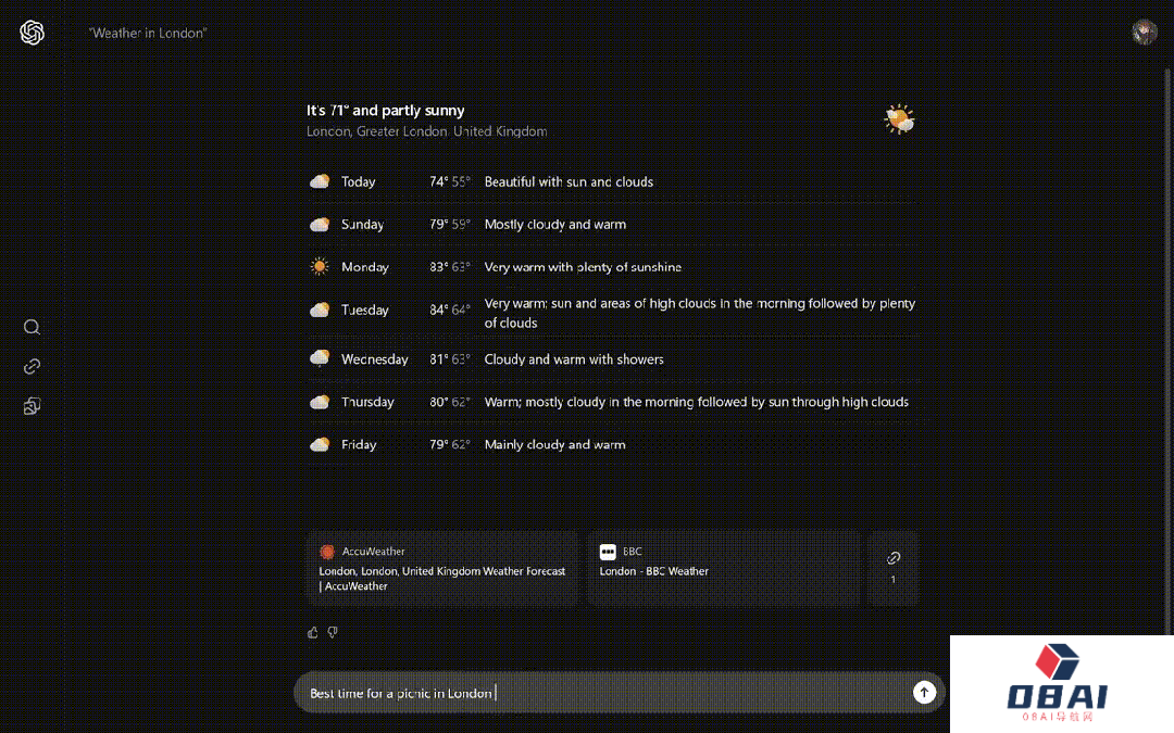 比如询问它伦敦天气,SearchGPT先给出了未来七天的天气预报。