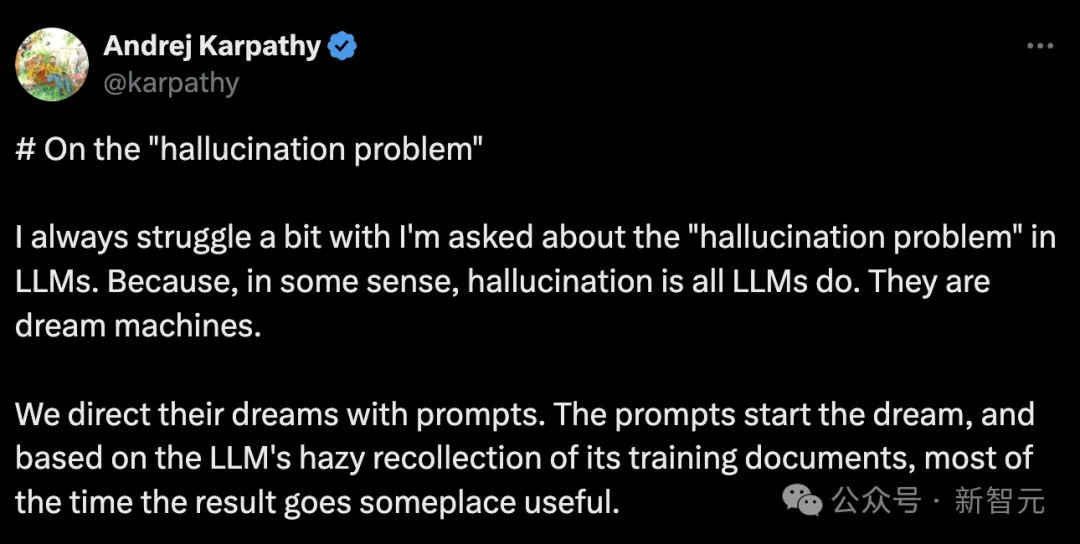 而且,Andrej Karpathy大佬曾经在推特上表达过这样的观点:「幻觉并不是bug,而是LLM最大的特点。」