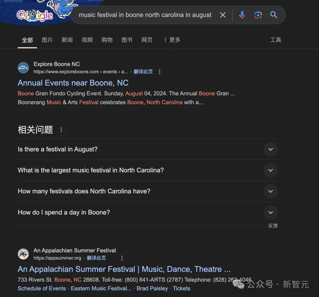 比如SearchGPT放在首行的「阿巴拉契亚夏季节」(An Appalachian Summer Festival),也同样是谷歌搜索的第二位结果。