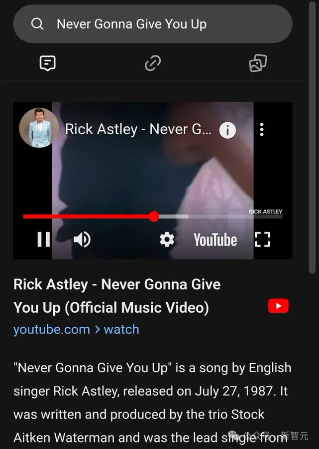 输入一首歌名「Never Gonna Give You Up」,然后直接给出了YouTube歌曲视频,不用跳转到其他网页,在一个页面就可以听歌、看视频。