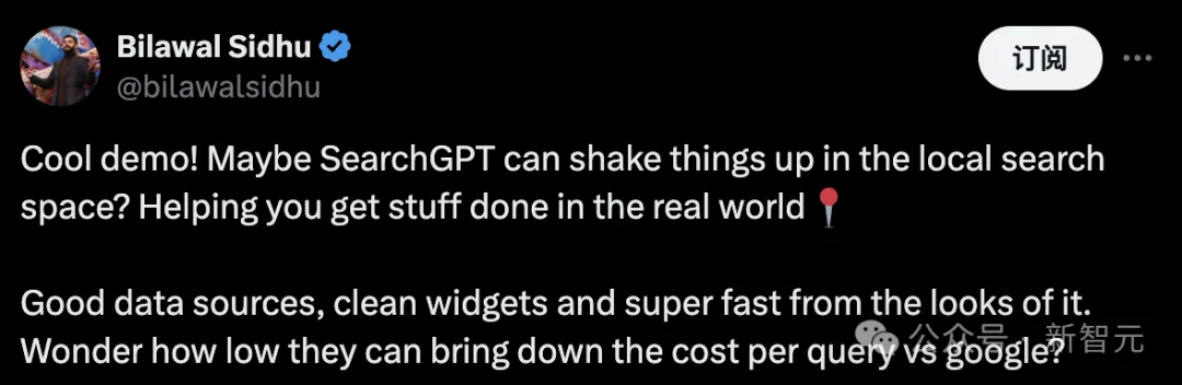 有网友对此评价道,「很酷的演示!也许SearchGPT能在本地搜索领域带来一些变革?它能帮助你在现实世界中完成事情。从外观来看,它有很好的数据源、简洁的小部件,而且速度超快。不知道与谷歌相比,他们能把每次查询的成本降低到多少」?