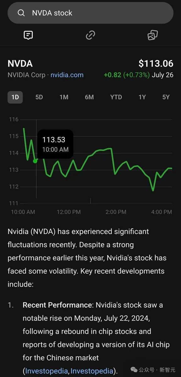查询英伟达股票,会给出英伟达股票整体的可视化图,随后给出了一些分析。所有股票信息都被无缝集成在页面中。