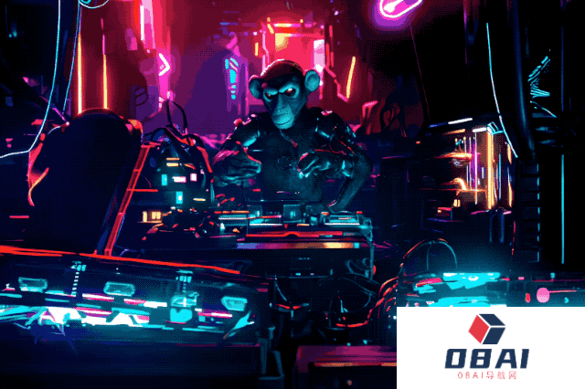 霓虹灯闪烁的城市夜景中,一只充满赛博美感的小猴手持高科技工具,修理着同样闪烁、超未来的电子设备。