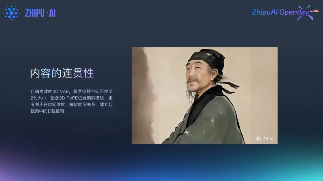 在内容连贯性上,智谱 AI 自研高效三维变分自编码器结构(3D VAE),将原视频空间压缩至 2% 大小,配合 3D RoPE 位置编码模块,更有利于在时间维度上捕捉帧间关系,建立起视频中的长程依赖。