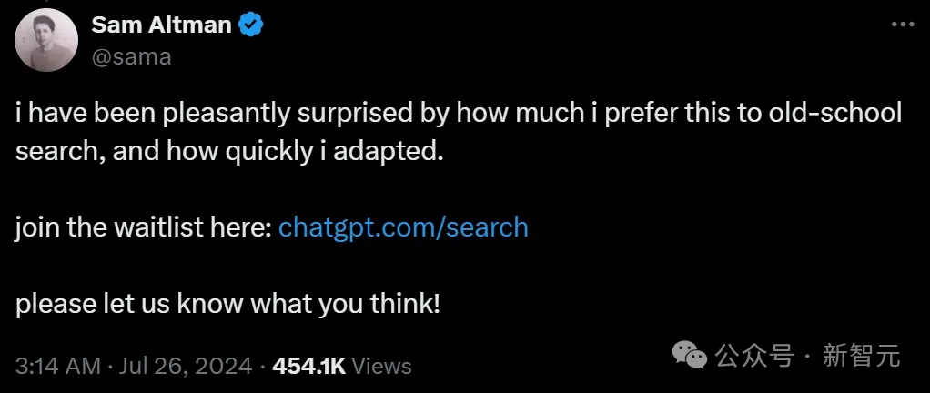 尝试过SearchGPT的奥特曼,对于自己的全新搜索非常满意,表示跟老式搜索相比,自己更喜欢这种方式。