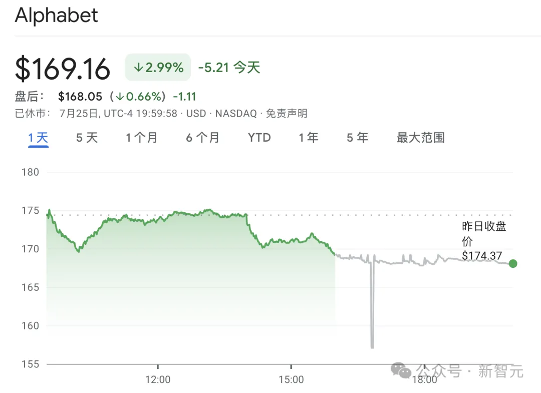 OpenAI的帖子和博客发出后,谷歌母公司Alphabet的股价也变成了绿油油的一片。