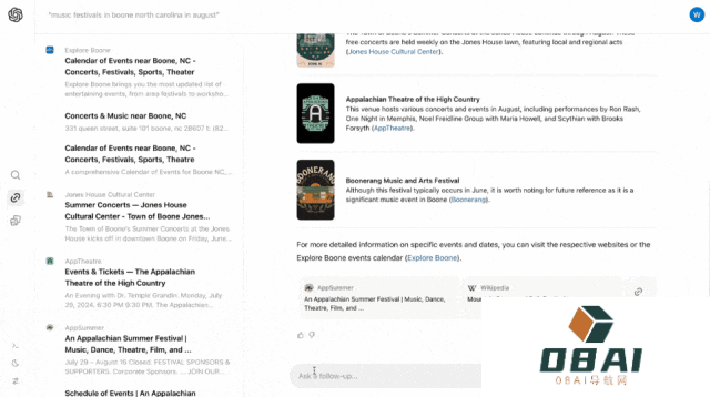 SearchGPT瞬间把几个相关的音乐节排列得清清楚楚,点击左侧边栏的链接按钮,还可以看到信息的来源,一键跳转买票。