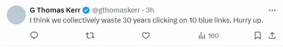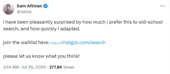 Sam Altman表示,相比谷歌、Bing那种传统的老搜索引擎,更喜欢这种只需要输入文本提示的生成式AI搜索。