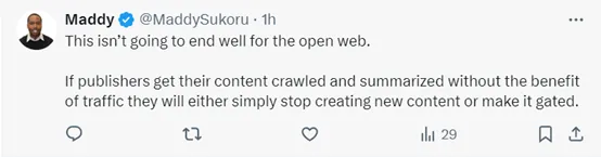 但也有人提出了担忧,如果发布商在没有流量优势的情况下对其内容进行爬网和汇总,要么停止创建新内容,要么对其进行限制。