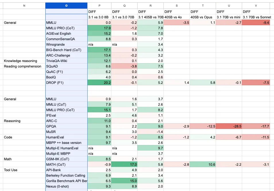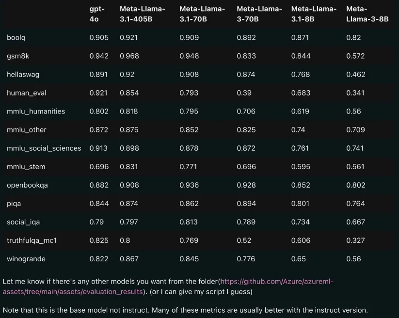 根据附带的说明,这还只是 base(基础)模型的评测结果,经过进一步指令微调,性能还有望提升。也就是说,如果泄露的数据靠谱,那么 Llama 3.1 或将上演一场开源逆袭最强闭源大模型的史诗级奇迹。
