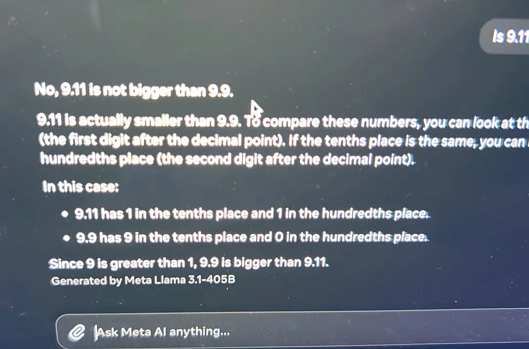 有意思的是,根据此前 Hugging Face 某个工程师泄露的信息,面对令众多大模型频繁翻车的「9.11 和 9.9 哪个大」难题,Llama 3.1-405B 也能游刃有余。