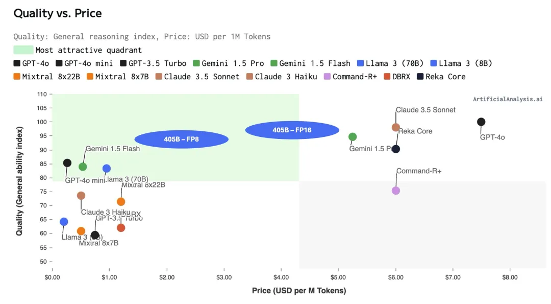X 用户 @ArtificialAnlys 也预测了 Llama 3.1 405B 的质量与价格定位: