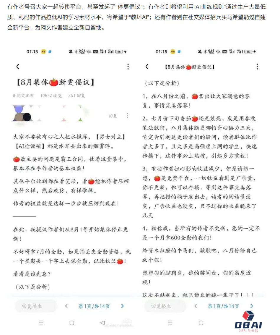 7 月 22 日,据蓝鲸新闻报道称,近期有不少网文作者发帖称,字节跳动网文平台“番茄小说”的签约协议中增加了“AI 训练补充协议”,要求作者同意给平台“喂”作品,用于“内容开发”。
