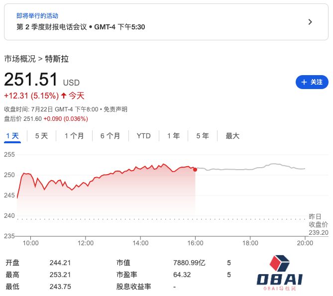 受到此利好消息影响,7月22日当天美股盘后,特斯拉股价大涨5%,收于251美元每股,市值重返7900亿美元,公司即将于当地时间本周二公布上一季度的财报。