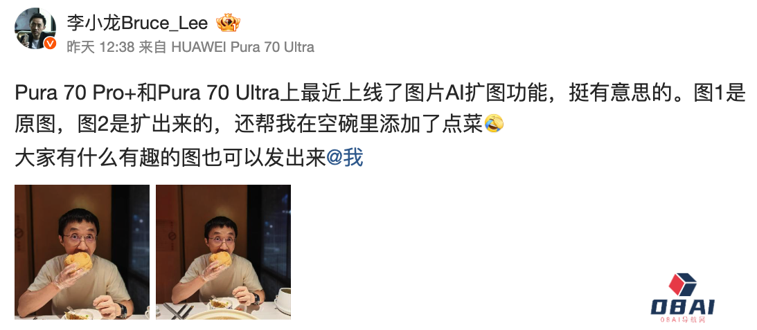 7月22日,华为终端BG首席技术官李小龙在微博上晒出两张吃饭的照片表示,左边是自拍的原图,右边是华为Pura 70 Ultra扩图的效果,还戏称:“AI还帮我在空碗里添加了点菜。”