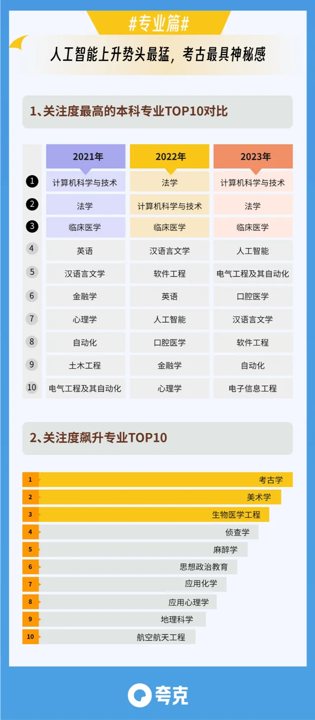 人工智能在给就业市场带来巨大变化,并且直接影响到了大学专业选择的趋势。近日,阿里旗下AI搜索平台夸克APP发布的《2023高考志愿报告》中显示,计算机科学与技术占据第一,排名前十的专业里,也以人工智能相关专业为多。