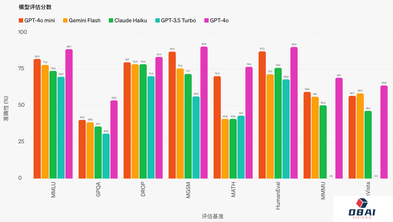 而在多模态推理 MMMU 中,GPT-4o mini 也表现出色,得分为 59.4%,而 Gemini Flash 得分为 56.1%,Claude Haiku 得分为 50.2%。