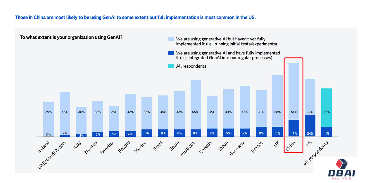 54%的受访企业主已开始实施生成式AI在企业内部的应用,其中11%已在企业层面完全集成该技术。86%的公司计划在今年或者明年投资生成式AI服务。