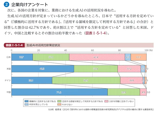 就在上周,日本的总务省(相当于我们的***)也发布了一份针对2024年生成式AI应用的市场调查报告,结果也是中国在生成式AI的应用领域排名第一,应用渗透率也超过美国、日本、英国等发达国家。