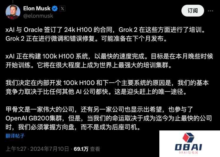 马斯克在文中写道,xAI 正打造一台拥有 10 万块英伟达 H100 GPU 的超级计算机,并且基于 H100 算力集群训练 Grok 2大模型,目前正在进行微调和修复,最快新一代的 Grok 大模型将会在 8 月份发布。