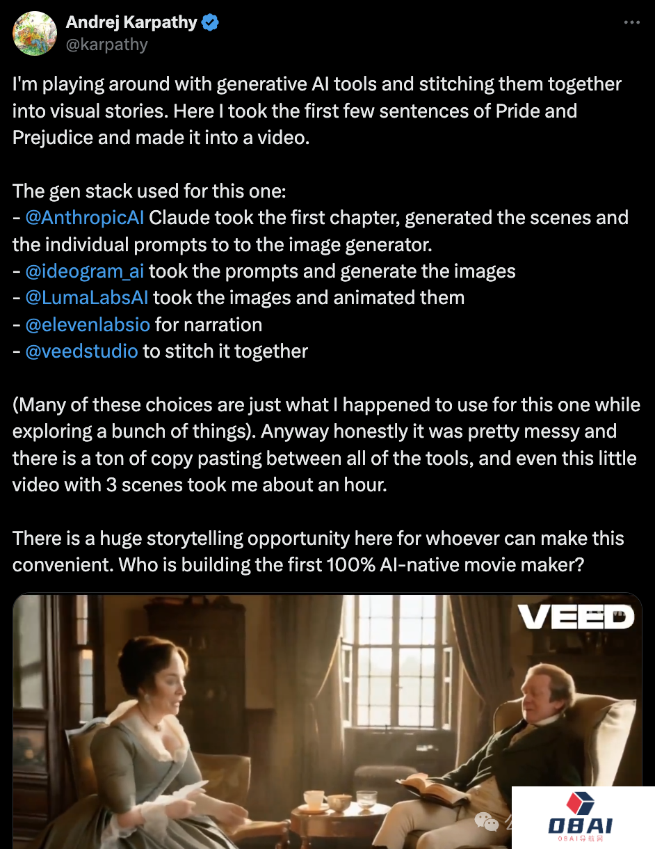 举个例子,OpenAI创始成员Andrej Karpathy最近也玩上了AI视频,整出了个AI版《傲慢与偏见》。