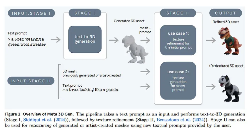 Meta 介绍,3DGen 支持基于物理的渲染,并支持对第三方生成的 3D 内容进行重新纹理生成。