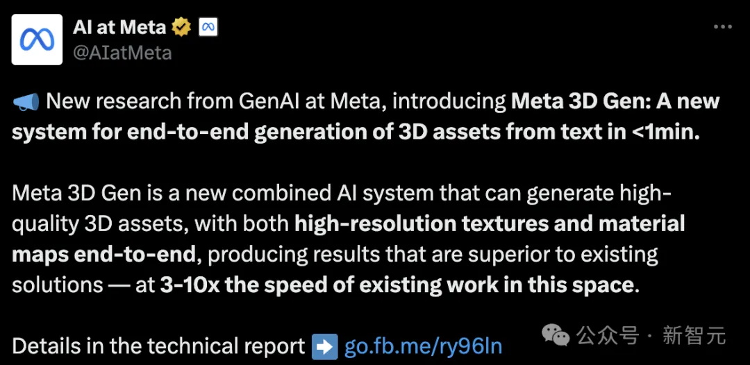 Meta的GenAI团队在最新研究中介绍了Meta 3D Gen模型:可以在不到1分钟的时间内从文本直接端到端生成3D资产。