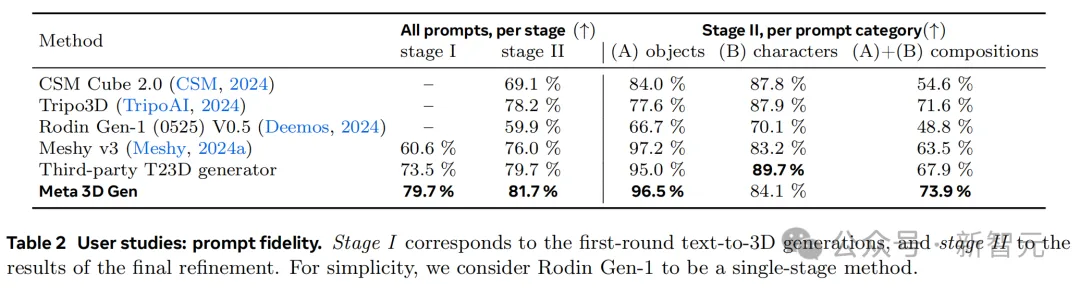 表2展示了提示忠实度方面的的评估结果。在这一指标上,3DGen在两个阶段的得分都优于其他行业方法,紧随其后的是T23D生成器。