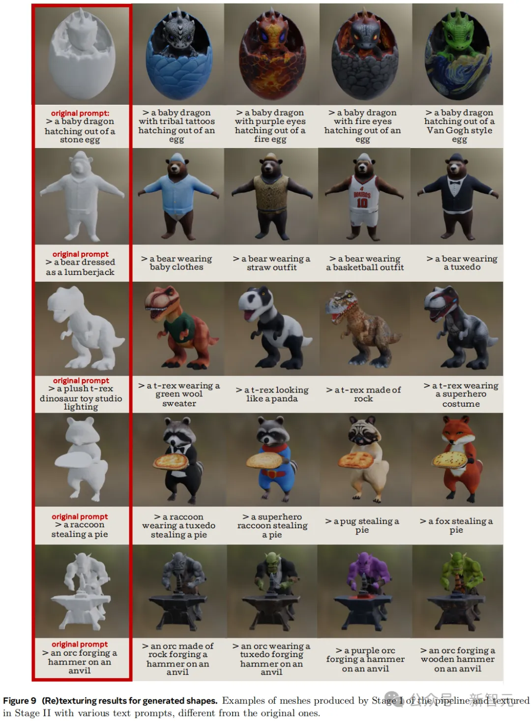其中,第二阶段的TextureGen也可以单独拿出来使用。如果有一个之前生成的,或者艺术家自己创作的无纹理3D网格,提供描述外观的文本提示后,模型也能在20s左右的时间中为它从头生成纹理。