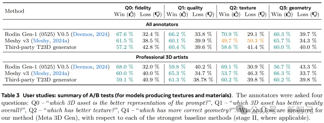 实验证明,不仅AssetGen和TextureGen两个部件都能分别取得更好的效果,它们结合后形成的3D Gen也能以68%的胜率超过其他模型。