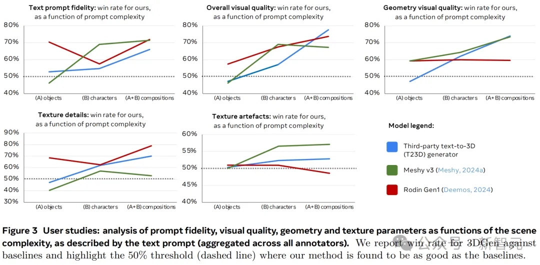 图表显示,虽然基准模型在简单提示下的表现与3D Gen相当,甚至更优,但随着提示复杂度逐渐增加,3D Gen开始反超,这也与图7描述的定型结果一致。