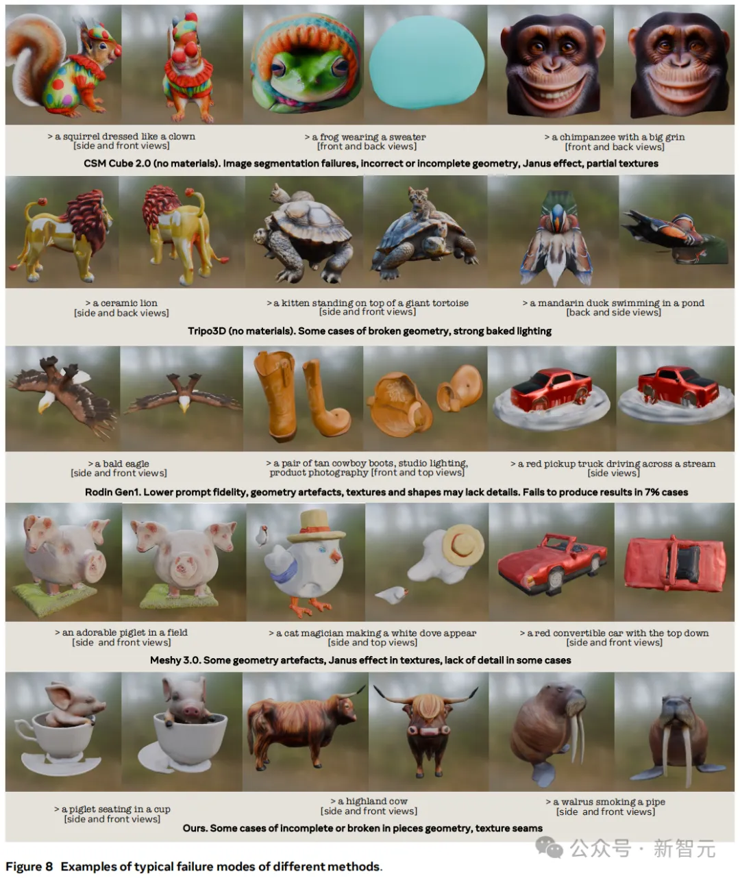 对于一些比较有挑战性的提示,3D Gen的细节效果有时逊色于Meshy v3等模型,但这涉及到一个权衡问题:要展现纹理中的高频细节,代价就是有时会出现视觉失真。