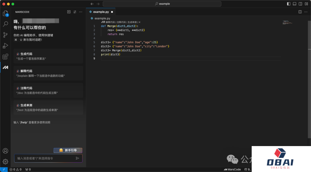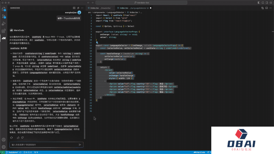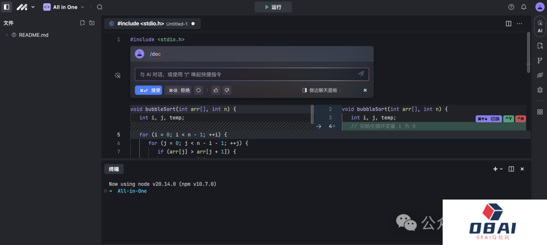 豆包MarsCode IDE 在 AI 交互上可以选择编辑器内或在侧边栏对话,快捷键唤起十分便捷。