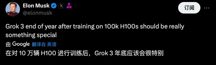 马斯克对于新一代模型的爆料还不仅如此,他直接宣布代号为「Grok 3」的下一代大模型将会在今年年底公开。这是一款将在10万张英伟达H100显卡集群上进行训练的超级参数大模型。