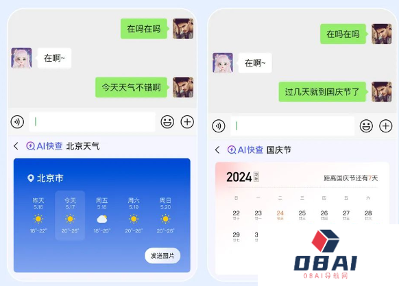 AI 快查支持边输边查、即输即用,提供天气、日历、汇率、金价等 22 类实时查询,免应用切换。