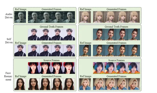 用户通过AniPortrait用音频和人物图片就能自动生成音频同步的视频,例如,让李云龙、新恒结衣、蔡徐坤的图片轻松唱歌、说话。