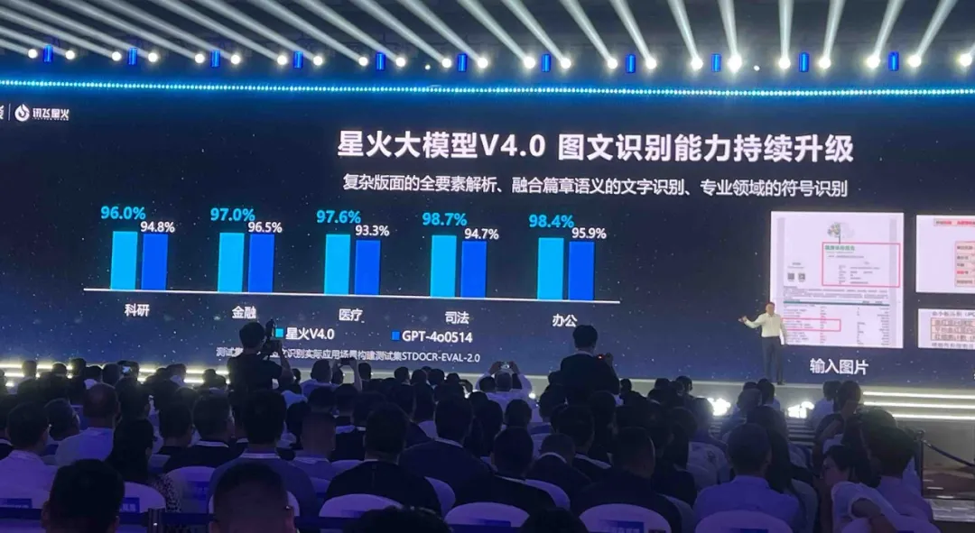 在多模态方面,星火大模型的图文识别能力持续升级,针对科研、金融、医疗、司法和办公等专业场景,科大讯飞进行了专门针对训练,图文识别能力超越了OpenAI当前的旗舰大模型GPT-4o。