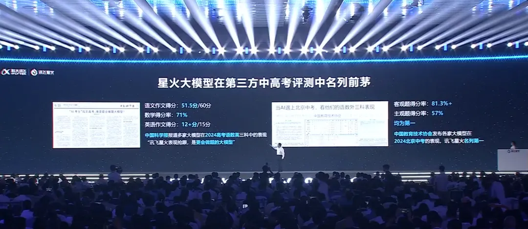 以2024年北京中考为例,星火大模型V4.0发挥稳定,取得了主、客观题得分率的双料第一,人为评定测评水平达到了一名中考考生的中等水平。
