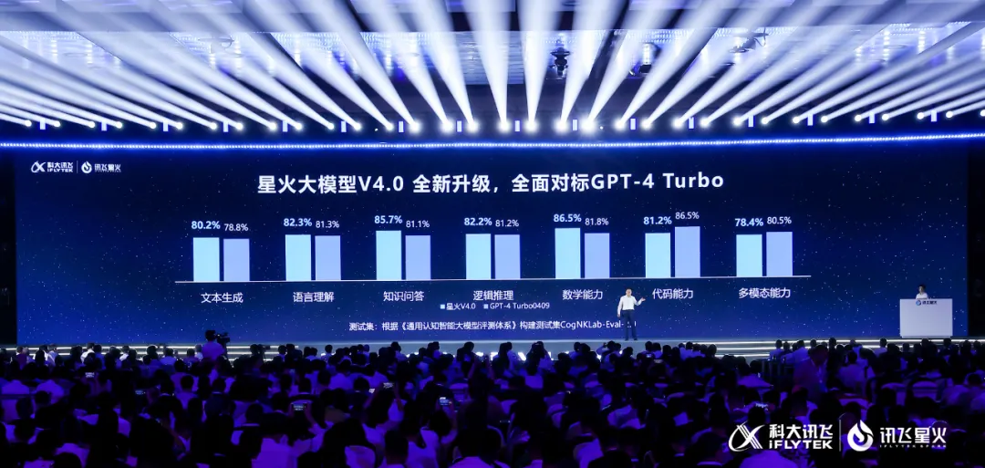 随着新版本的发布,讯飞星火V4.0的七大核心能力全面升级。早在今年1月底,星火大模型发布V3.5版本,在语言理解、数学能力方面就号称超过了GPT-4 Turbo,但代码、多模态等其他能力与后者仍有一些差距。