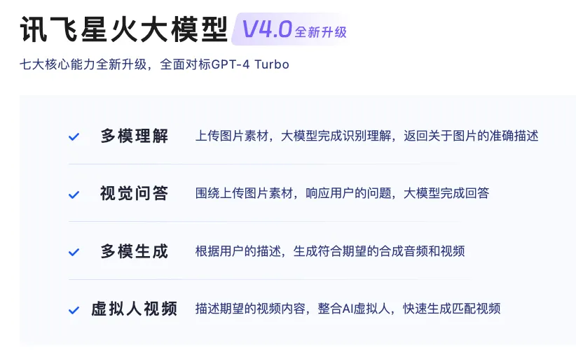 除了底座七大核心能力的全面提升,此次星火大模型V4.0在指令跟随、文本、多模态、推理能力等多个方面还进行了针对性的性能优化和功能创新。