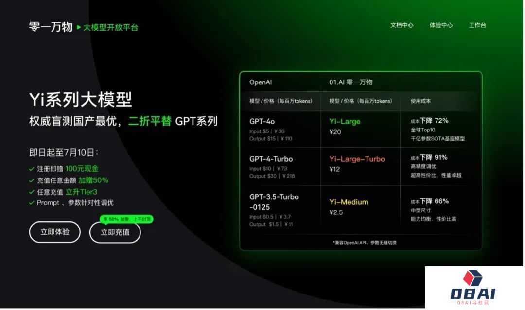 ⚫️零一万物:发起「Yi 系列大模型 API 二折平替计划」,面向 OpenAI 用户推出了平滑迁移至 Yi 系列大模型的服务。此外,针对接入 OpenAI 的不同模型的用户,零一万物也一一对应地提供了高模型性能且极具性价比的替换方案。