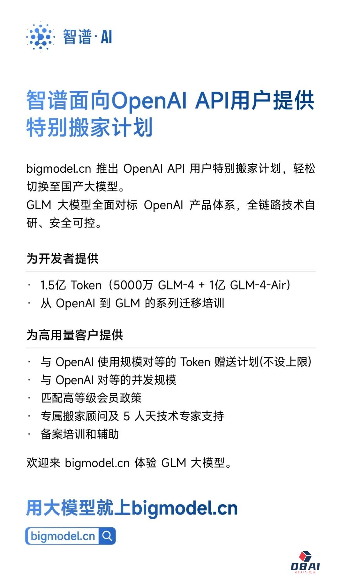 ⚫️智谱 AI:正式推出 OpenAI API 用户特别搬家计划,同时还会为开发者提供1.5亿 Token 及从 OpenAI 到 GLM 的系列迁移培训。