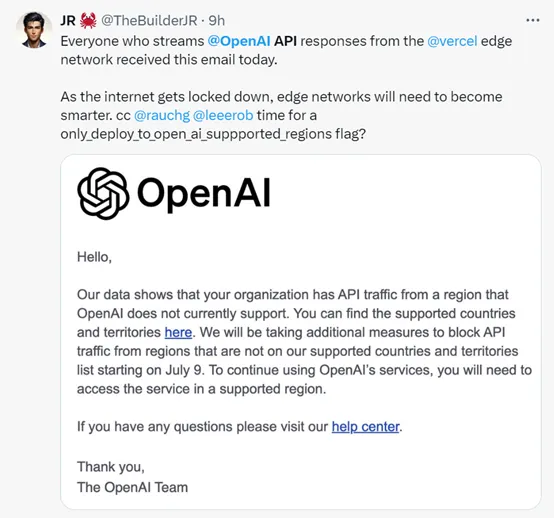 6月25日凌晨,有部分开发者收到了OpenAI的信,“根据数据显示,你的组织有来自OpenAl目前不支持的地区的API流量。从7月9日起,将采取额外措施,停止来自不在OpenAI支持的国家、地区名单上的API使用。”