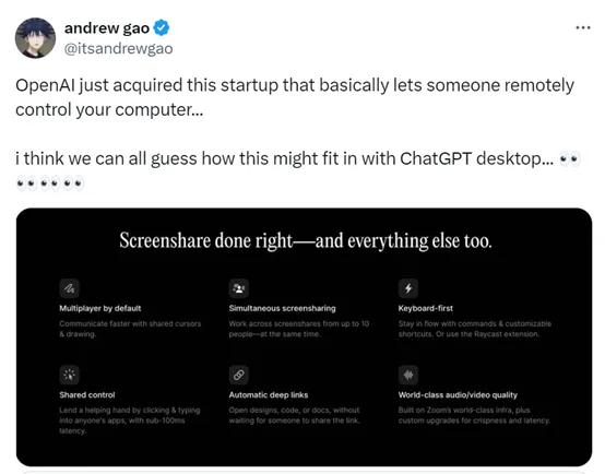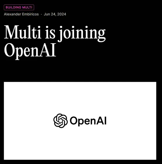 此外,远程桌面协作平台Multi在今天凌晨宣布加入OpenAI,并在7月24日之前关闭其产品。Multi的大约5人团队将加入ChatGPT桌面团队。